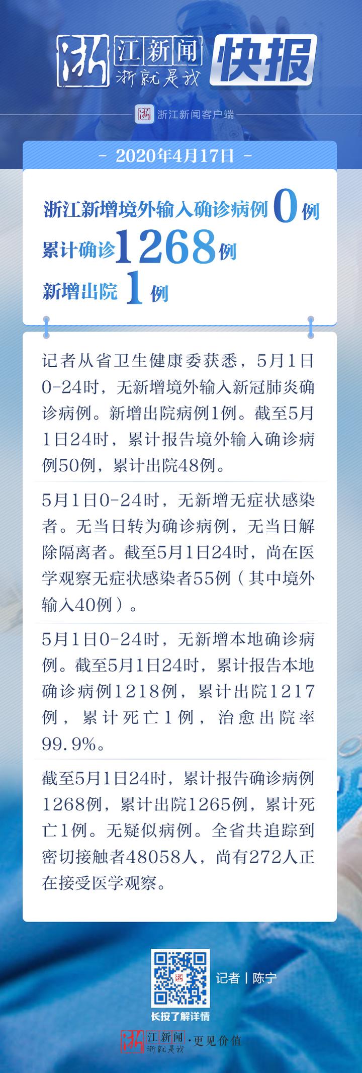 5月1日浙江无新增确诊病例 新增出院病例1例 http://www.tlnews.com.cn/2020年05月03日 09:06:50 浙江新闻客户端 原标题: 5月1日浙江无新增确诊病例 新增出院病例1例 作者:记者 陈宁 网络编辑:程佳园