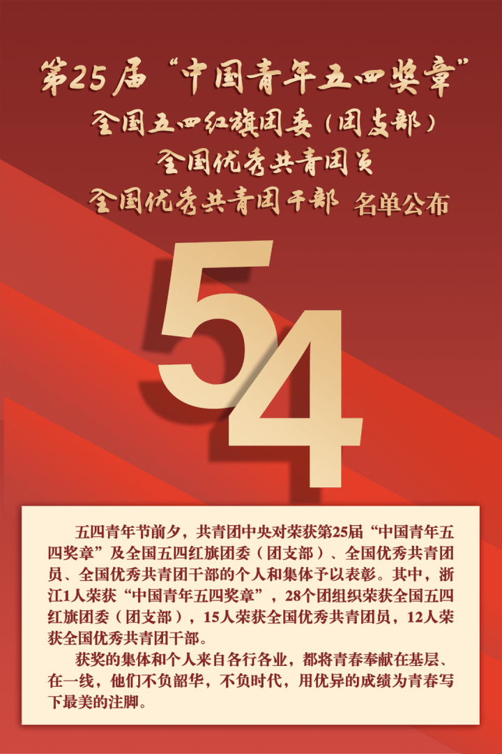 第25届“中国青年五四奖章”等名单公布 浙江这些个人和集体获表彰 http://www.tlnews.com.cn/2021年05月04日 10:42:28 浙江发布 原标题: 第25届“中国青年五四奖章”等名单公布 浙江这些个人和集体获表彰 作者: 网络编辑:吴晓斌