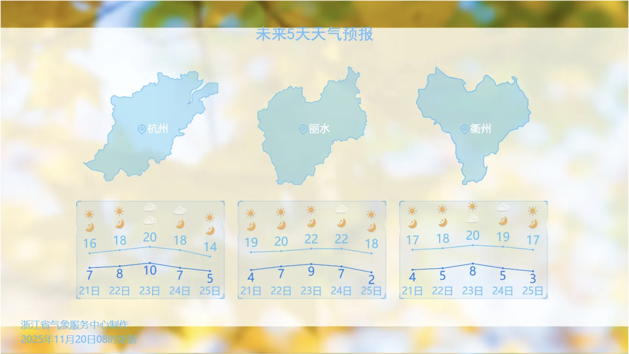 | 周末快到了,天气传来一个好消息:气温开始触底反弹。 昨天(11月20日)午后,在阳光的补温作用下,气温大幅攀升,体感舒适不少。最高气温浙江大部来到了15℃线上下,最高的龙泉达到了18.5℃。 不过,在冷空气和晴空辐射影响下,早晨最低气温还是创下了今年下半年新低——不少地区的最低气温在0℃线附近徘徊,开化(-0.8℃)、遂昌(-0.7℃)、磐安(-0.5℃)三地首次跌破0℃,再让大家切实感受到了冬天的到来。 今起三天,最低气温也终于跟上上涨节奏,早晨出门压力稍稍减轻。