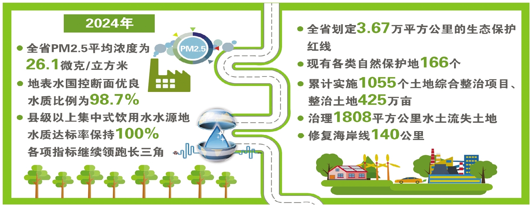 制图 王璟 杭州日报讯 生态文明建设是关系中华民族永续发展的根本大计。五年来,浙江如何聚力,让生态文明建设成果更好造福于民?11月25日,省政府新闻办举行浙江省高质量完成“十四五”规划系列主题第八场新闻发布会,介绍“十四五”时期浙江深入践行绿水青山就是金山银山理念,加快推进生态文明建设先行示范情况。 据介绍,“十四五”以来,全省深入践行绿水青山就是金山银山理念,协同推进降碳、减污、扩绿、增长,生态环境质量稳步改善,生态环境公众满意度保持14年连升,环境信访总量连续9年下降,“蓝色循环”海洋塑料废弃物治理模式继“千万工程”后再获联合国“地球卫士奖”,绿色成为浙江高质量发展的鲜明底色。 五年来,浙江聚焦小微水体、噪声油烟、生活垃圾等群众身边的环境问题,开展“美丽河湖”“宁静小区”“无废城市”建设,让群众更真切感受到优美生态环境给生活带来的变化。2024年,全省PM2.5平均浓度为26.1微克/立方米;地表水国控断面优良水质比例为98.7%,县级以上集中式饮用水水源地水质达标率保持100%,各项指标继续领跑长三角。在优化交通运输结构方面,全省累计淘汰老旧柴油货车31.5万辆,基本淘汰国三柴油货车,城市公共服务车辆新能源化比例达到90%。 为不断提升生态系统多样性、稳定性,全省划定3.67万平方公里的生态保护红线,现有各类自然保护地166个,为各类野生动植物打造“天然庇护所”;围绕土地、矿山、海洋保护修复,累计实施1055个土地综合整治项目、整治土地425万亩,治理1808平方公里水土流失土地,修复海岸线140公里。 生态惠民、生态富民方面,浙江在全国率先开展排污权、碳排放权等市场化交易,积极开发“碳效贷”“生态贷”“林业碳汇贷”等绿色金融产品,累计发放排污权抵押贷款1054亿元,让环境资源、生态资源变成可交易、可增值的“绿色资产”。因地制宜发展生态产业、打造生态品牌,推动50个生态环境导向开发(EOD)模式项目落地,带动环境治理和开发建设投资超1400亿元。 五年来,浙江还坚持全民行动、共建共享,把生态文化融入生产生活的方方面面,承办首个全国生态日主场活动、第五届世界生物圈保护区大会,举办践行绿水青山就是金山银山理念20年主题展,持续开展环保设施公众开放、青少年“生态第一课”、环境保护公益巡演、全民生态运动、全民义务植树等系列主题活动,生态环保越来越成为村规民约、公序良俗,绿色出行、垃圾分类、光盘行动越来越成为公众自觉。 |