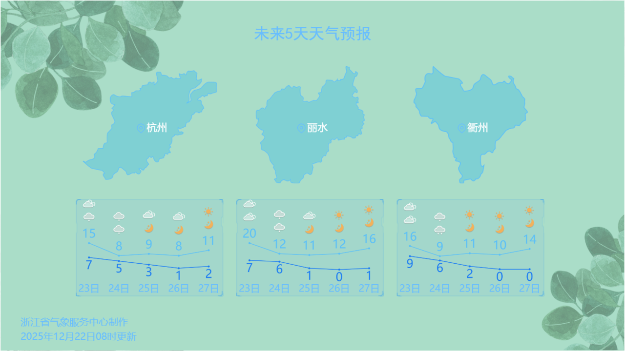 部分城市天气预报。图源:浙江天气 今天,气温还会再接再厉,继续冲向新高点,预计全省部分地区能达到18-21℃。 不过,转折来得很快。今天下午将要到来的这股冷空气直接吹响冬天的号角,“降温+降水(西北高海拔山区小雨夹雪或雪)+沿海大风”的组合套餐又来了,这次降水的“存在感”相比之前,可能会高一些,浙中地区24日或有中雨现身。 冷空气影响之下,25-29日早晨气温较低,我省大部不足3℃;24-26日我省大部最高气温也将不足10℃。 以杭州为例,今天晚上开始降温,日平均气温下降6-8℃,特别关注26-27日早晨最低气温平原地区-2℃~2℃,有薄冰或霜冻,山区-4℃~-2℃,有冰冻。而且,今天的冷空气可能会带来一些输入性污染,导致空气质量略有下降。好在前期污染物积累不多,不会像之前那么严重,但呼吸系统敏感人群外出时建议佩戴口罩。 后期,30日又会有干冷空气补充,我省将维持晴冷基调,气温再次冲2的难度系数很大,大家这回真的可以把羽绒服“焊”在身上了。 |
