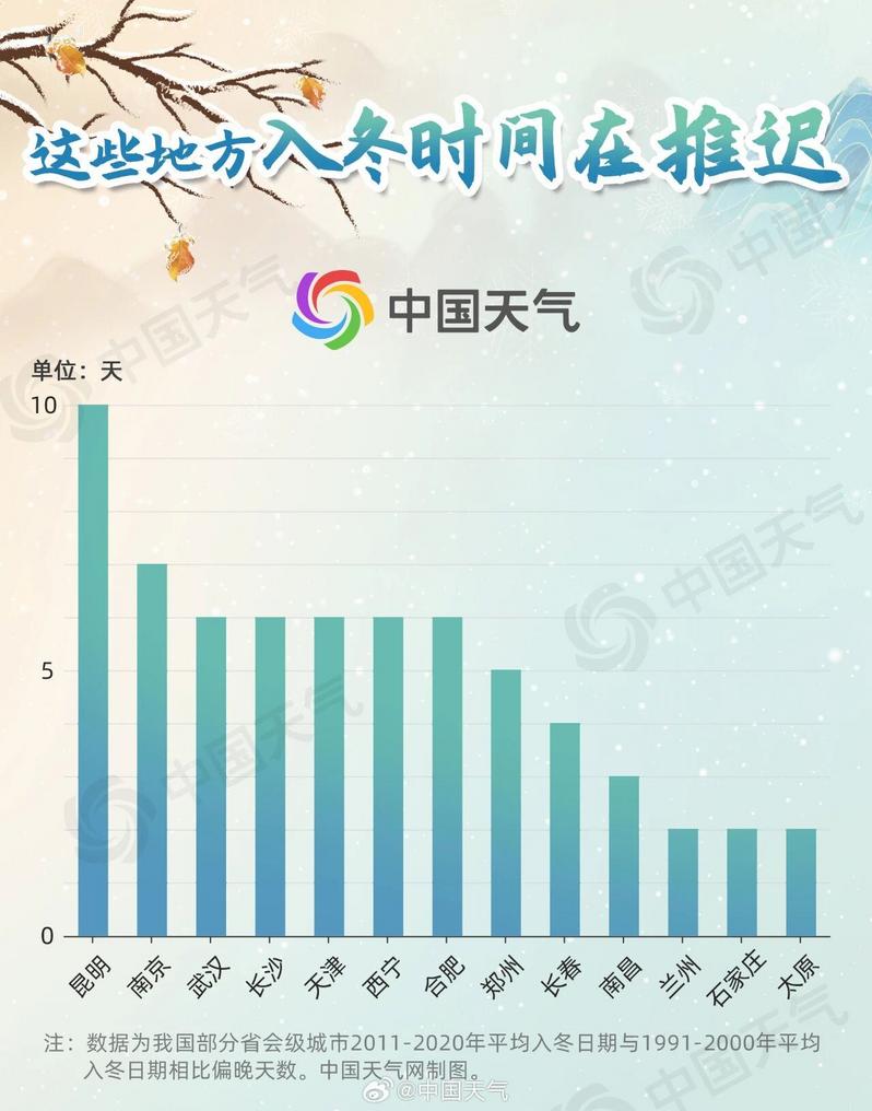 | 最新消息,宁波、绍兴、衢州、舟山、金华将于12月24日入冬;温州、丽水、台州12月25日入冬。冬至节气期间,大家纷纷宣布冬“至”,也可以算是另一种形式的应景。 不过,年底才“入冬”,真的很拖沓了。据省气象台统计,绍兴、宁波、衢州打破了当地最晚入冬纪录。今年以前,绍兴的最晚纪录为12月14日,出现在2021年;宁波晚纪录为12月23日,出现在2024和2016年;衢州的最晚纪录为12月22日,出现在1977年。 算起来,冬天迟到不是今年才有。中国天气网盘点大数据发现,近六七十年里,我国不少地方的冬季也在逐步推迟。